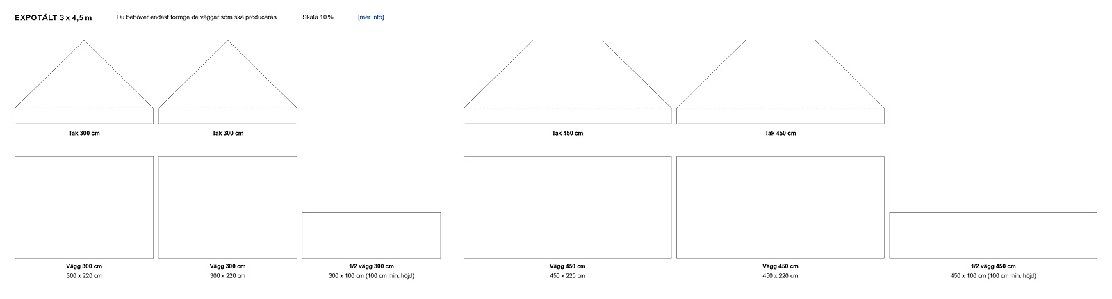 Storlek halv-vägg: 300 x 150 cm (tält 3 x 3 m) / 450 x 150 cm (tält 3 x 4,5 m)