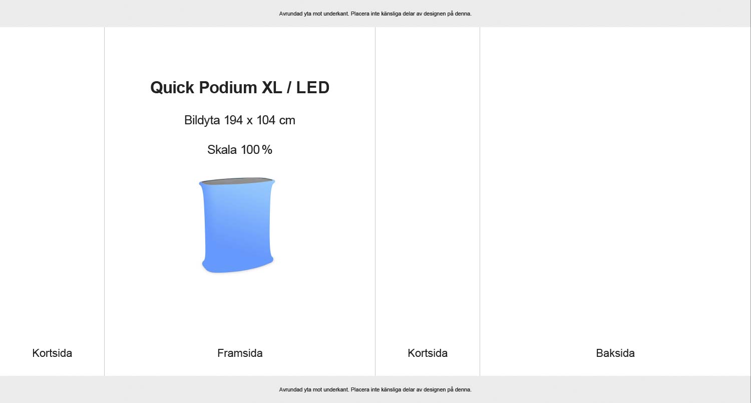 Quick Podium LED är den självuppresande monterdisken som kommer monterad och klar i sin ultrakompakta väska. Öppna väskan, ta ut systemet och anslut till vägguttaget – klart! Textilomslaget trycks på en speciellt skrynkeltålig textil som låter den invändiga LED-belysningen sprida ljuset jämt över hela ditt budskap. Duken kan bytas med ett par enkla handgrepp eller tas av för tvätt. Med ett belyst mässpodium får du verkligen ditt budskap att sticka ut.